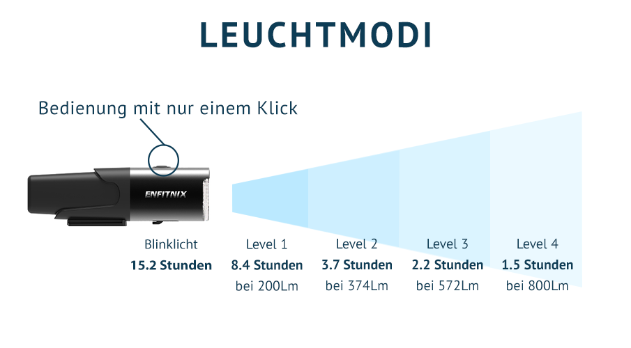 Betriebsart: Dauerbetrieb mit 4 Intensitätsstufen und blinkend