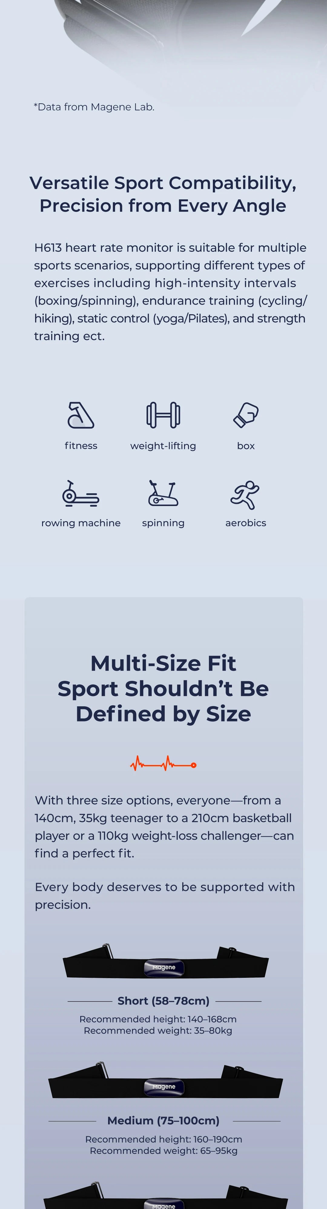 Magene bietet drei Größen (Short, Medium, Long) von ca. 58 bis 136 cm Brustumfang. Orientiere dich an deinem Brustumfang – der Gurt sollte fest sitzen, aber dank Anti-Rutsch-Silikon nicht „abgewürgt“ werden müssen.