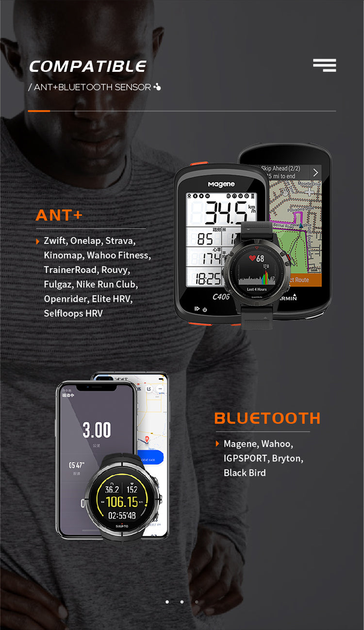 Kompatibel mit: Wahoo Elemnt (alle Varianten), Garmin Edge, Zwift, Taxc, Bkool, iGPSPORT, Bryton, Lezyne, Hammerhaed und diversen Apps wie bspw. Strava, Runtastic oder Runkeeper
